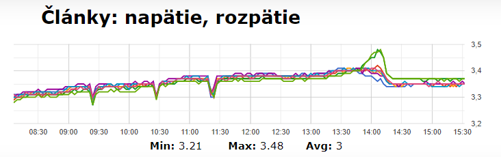 Čo myslíte, pomohol by takýto balancer aj na takéto správanie článkov? Majú 9 mesiacov, na nich paliče (123/SmartBMS) spaluju nad 3.45 V 1A, avšak napätia aj tak utekajú... Viď graf - dva problémové články sú počas BULK fázy napätím nižšie než ostatné, avšak nad 3.45 V vyletia hore a potom po odpojení packu od nabíjania / záťaže sa zasa držia hore...