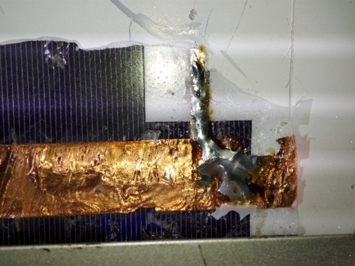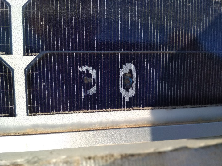 ... začiatkom týždňa systém stratil výkon a MPPT sotva udržal na baterkách 48V aj bez záťaže. dnes som sa k tomu konečne dostal, a meraním zistil že jeden z panelov má síce naprázdno 27V, ale max prúd ktorý je schopný dodať je asi 300mA. pri vizuálnej kontrole som na ňom objavil takéto poškodenie