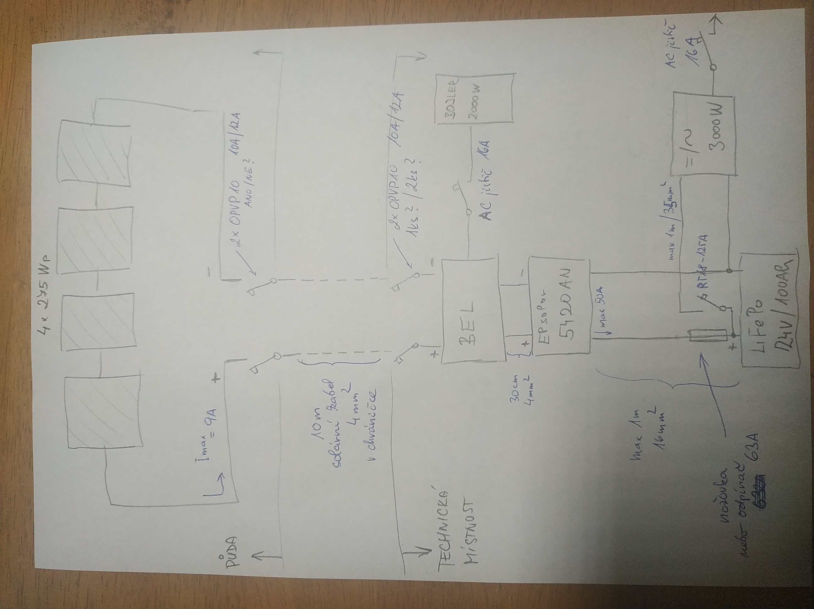 1. pole bude napojené na BEL + bojler na AC výstupu, "pod" BELem pak z DC výstupu bude napájen Epsolar 5420AN + baterie LiFePo 24V/100Ah + měnič 24V/3000W