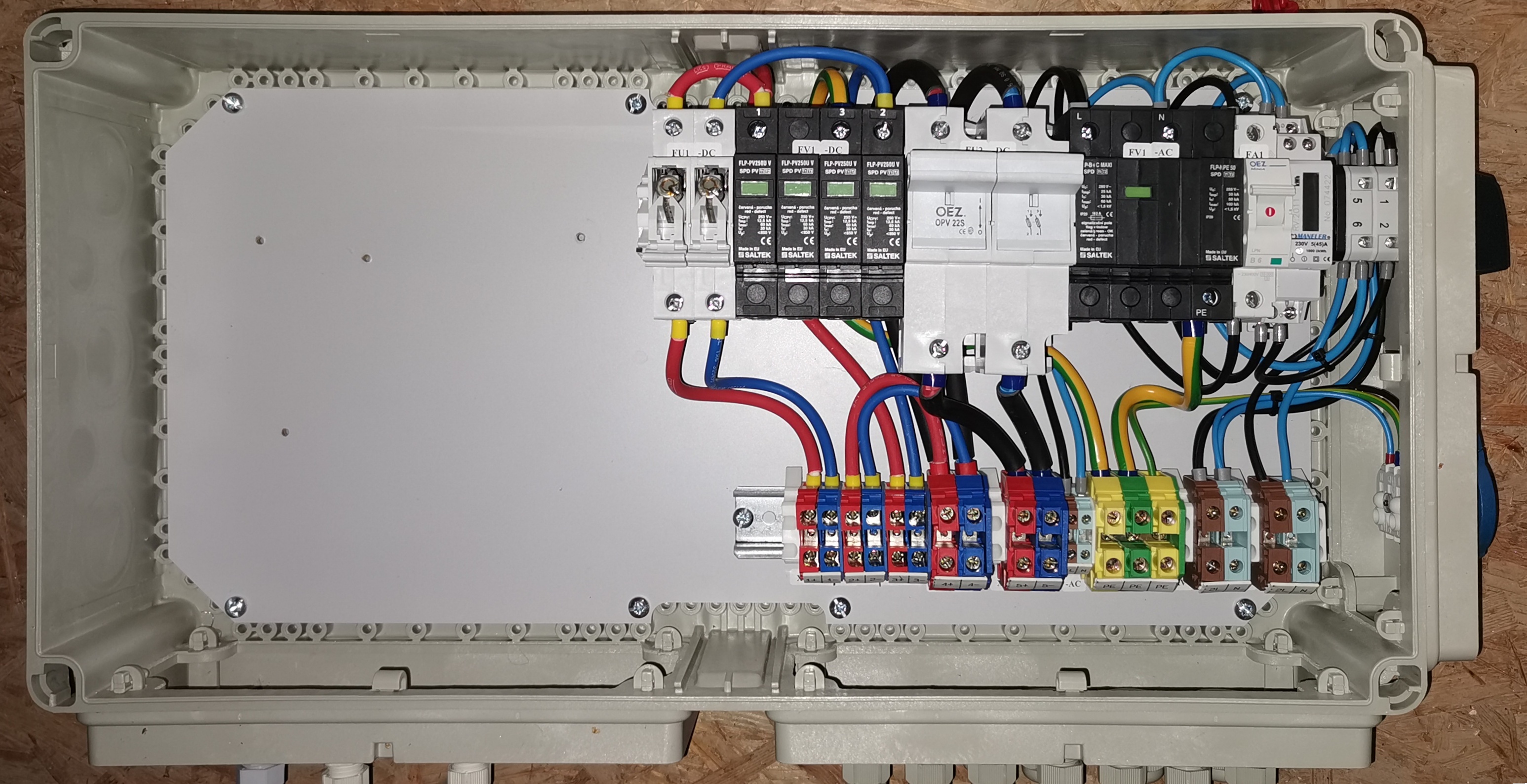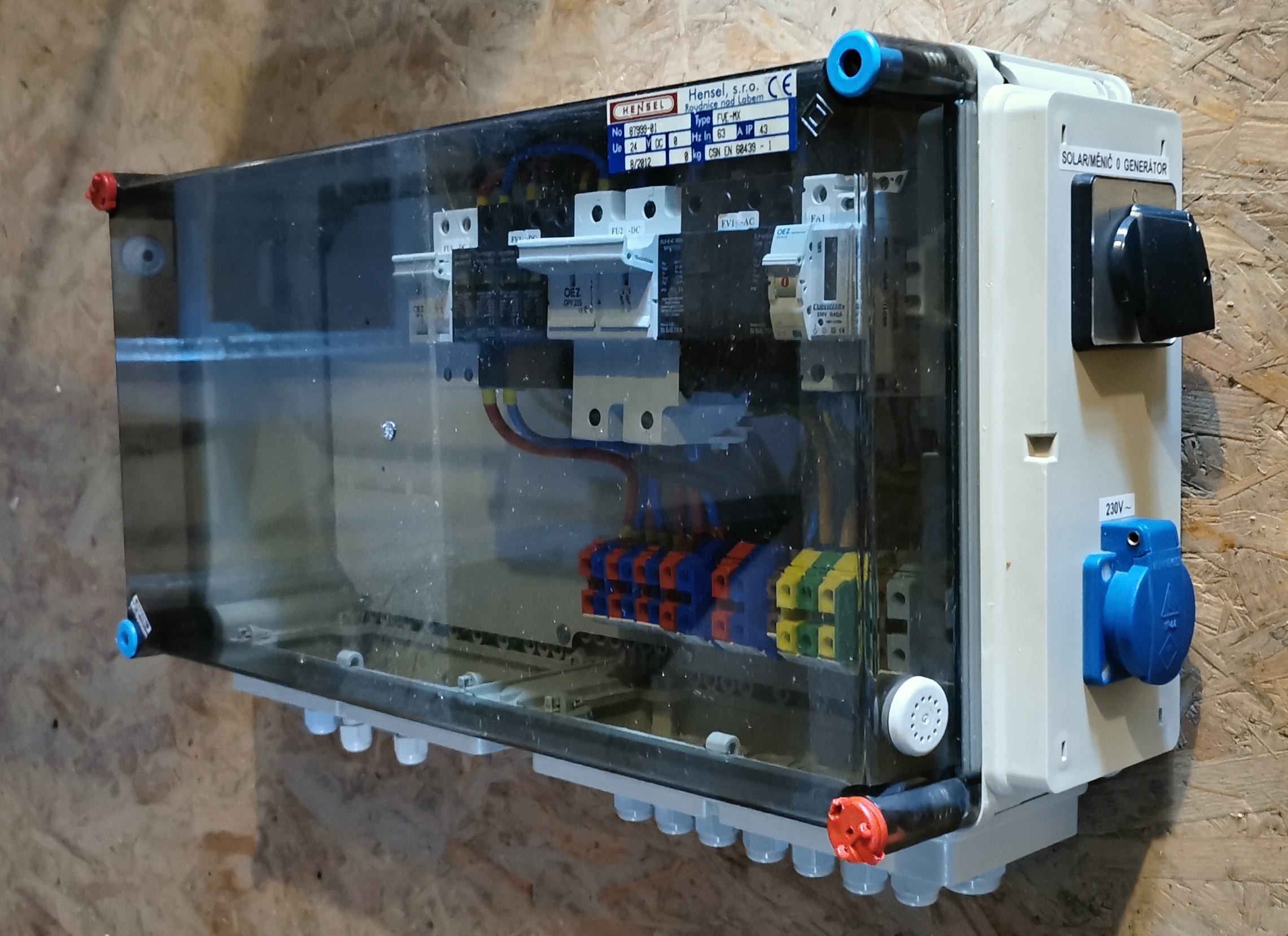 Prodám rozvaděč, který jsem si nechal dělat na zakázku od profesionálů když jsem předělávat svoji FVE z 12V na 24V. Rozvaděč obsahuje DC část zapojení od regulátorů, ochranu proti blesku, pojistkové propojení s bateriemi a s externím měničem 24/230V plus samostatně vyvedenou zásuvku 230V a AC přepínač Solar/Měnič a generátor (který je přiveden samostatným kabelem externě). A také AC jistič a elektroměr - vše viz výkresová dokumentace. V rozvaděči je dost místa na další případnou instalaci. Spodní kryt je osazen spoustou kabelových průchodek, pojistky jsou skoro všechny opravované (přeložím - měděný drátek na povrchu), tedy nepoužitelné, ale nechám je v rozvaděči... Samozřejmě kupující si může kabeláž předělat podle svých (dnešních) představ o zapojení.