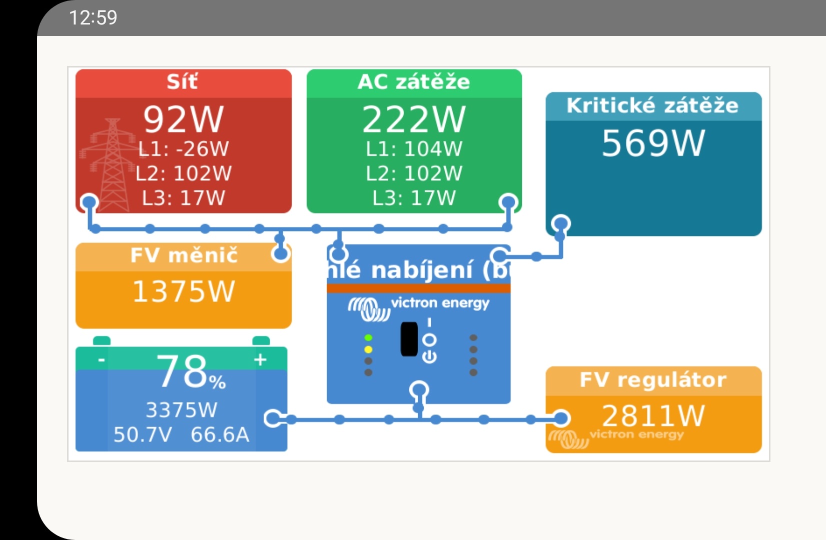 No a kde máš umístěné proudové čidlo, pokud jsem koukal na popis tak k tomu victronu by se mělo dát připojit zda to nefunguje pouze s ním.