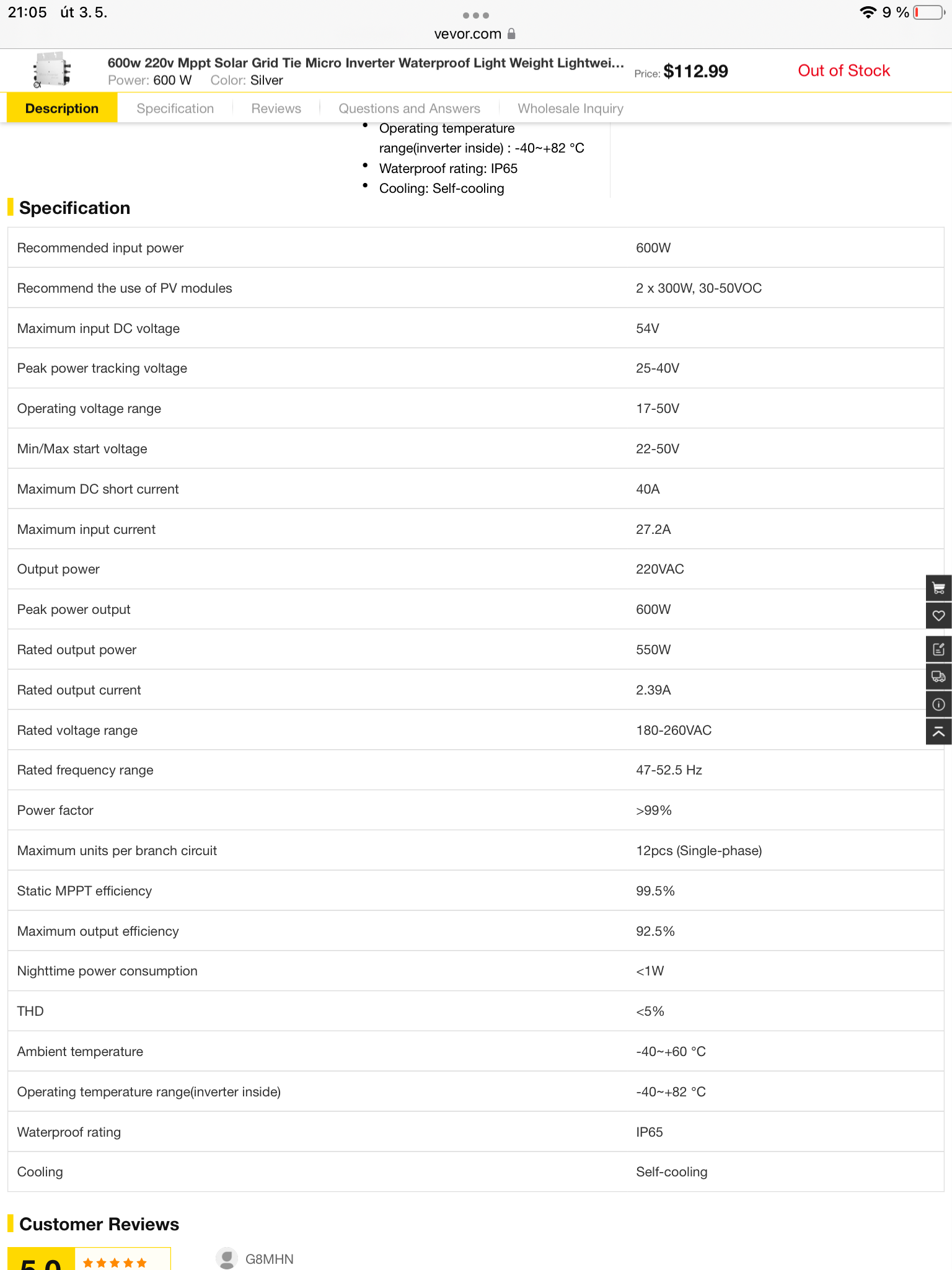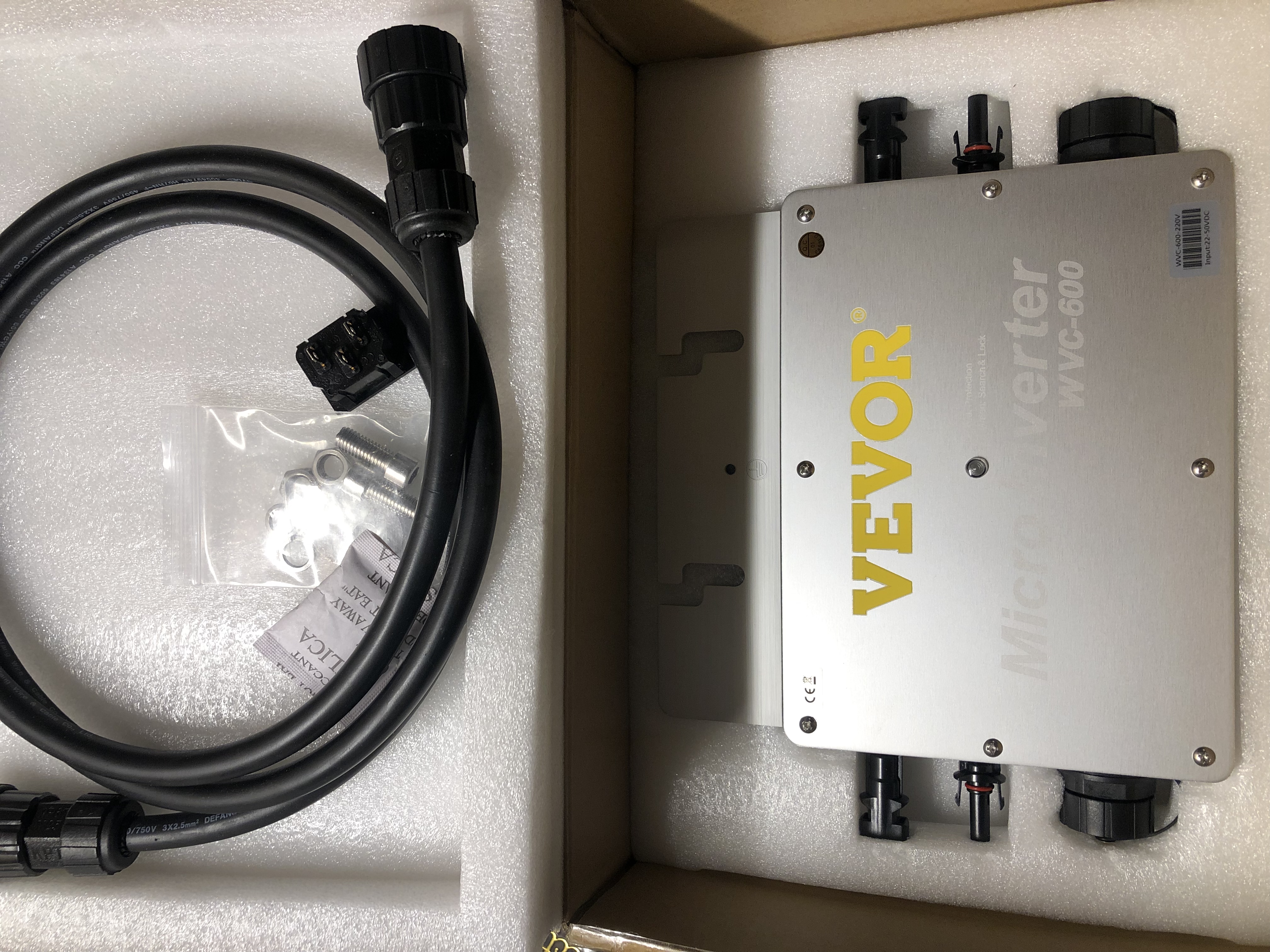 Nabízíme k prodeji dva nové grid tie mikroinvertory WVC-600 s výkonem 600 W. Cena je 1600 Kč za kus nebo 3000 Kč za oba. Přiložené fotografie ukazují detailní parametry těchto invertorů, které jsou vhodné pro solární instalace a efektivní využití domácí energie.