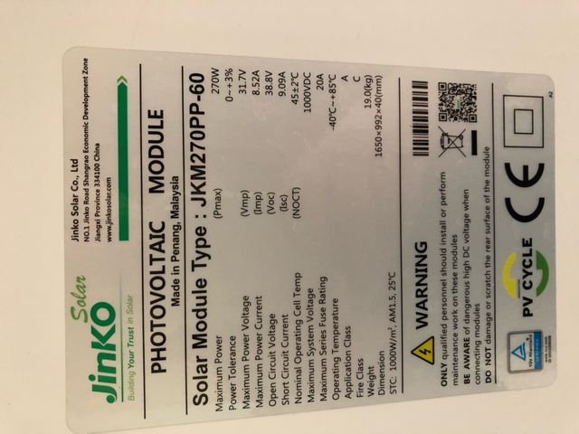 Nabízí se k prodeji použitý solární panel JinkoSolar s výkonem 270W, používaný necelé tři roky. Cena panelu je 2000 Kč a je možné jej vyzvednout v Prachovicích, okres Chrudim. Panel je vhodný pro domácí fotovoltaické systémy a další solární aplikace.