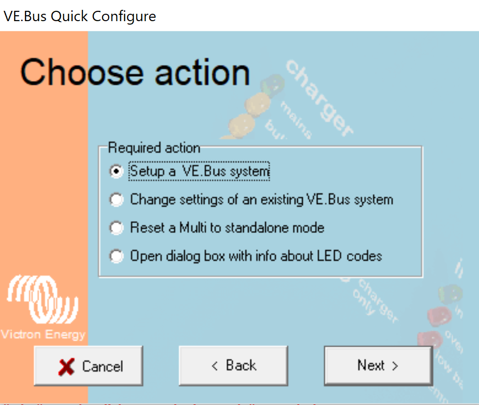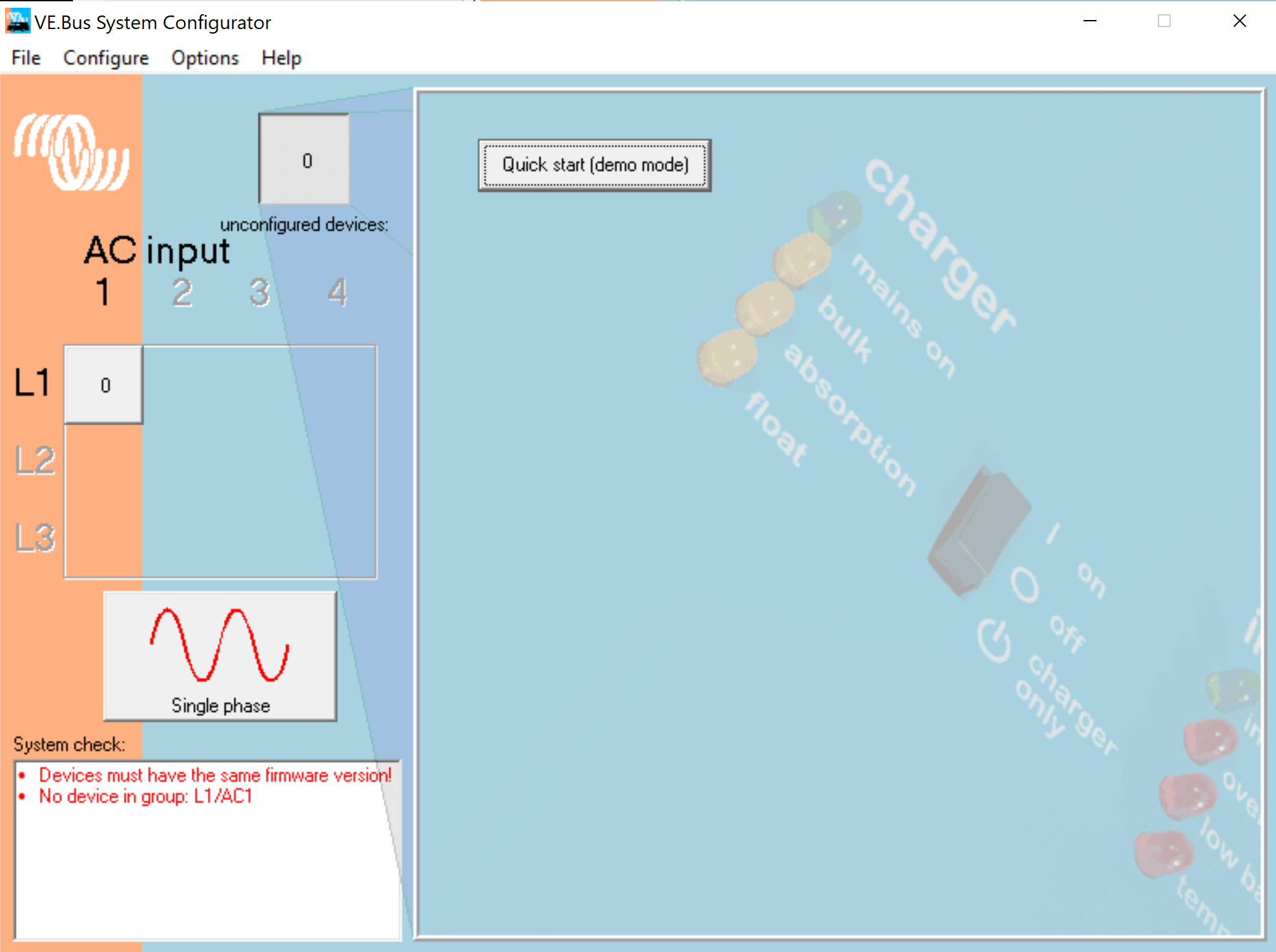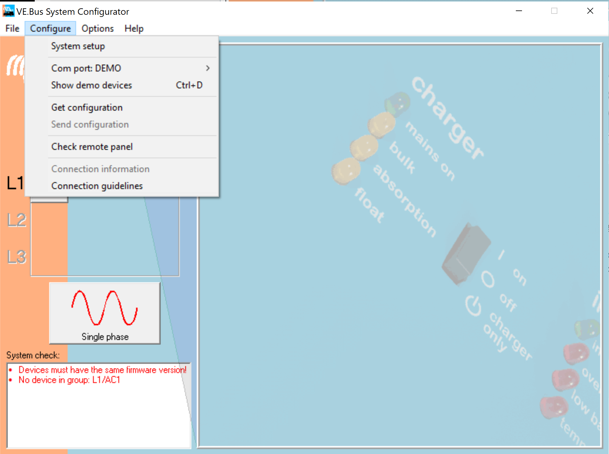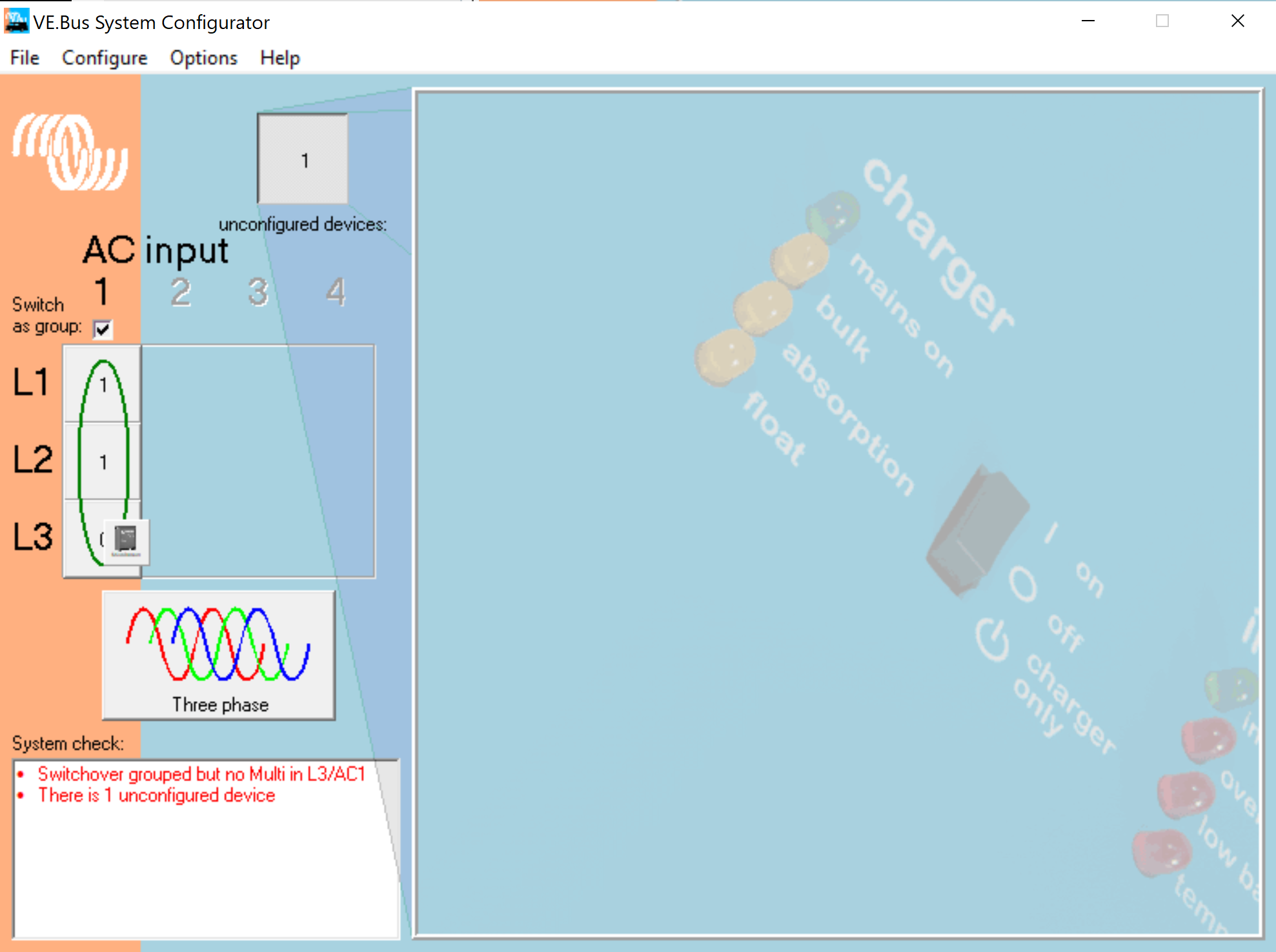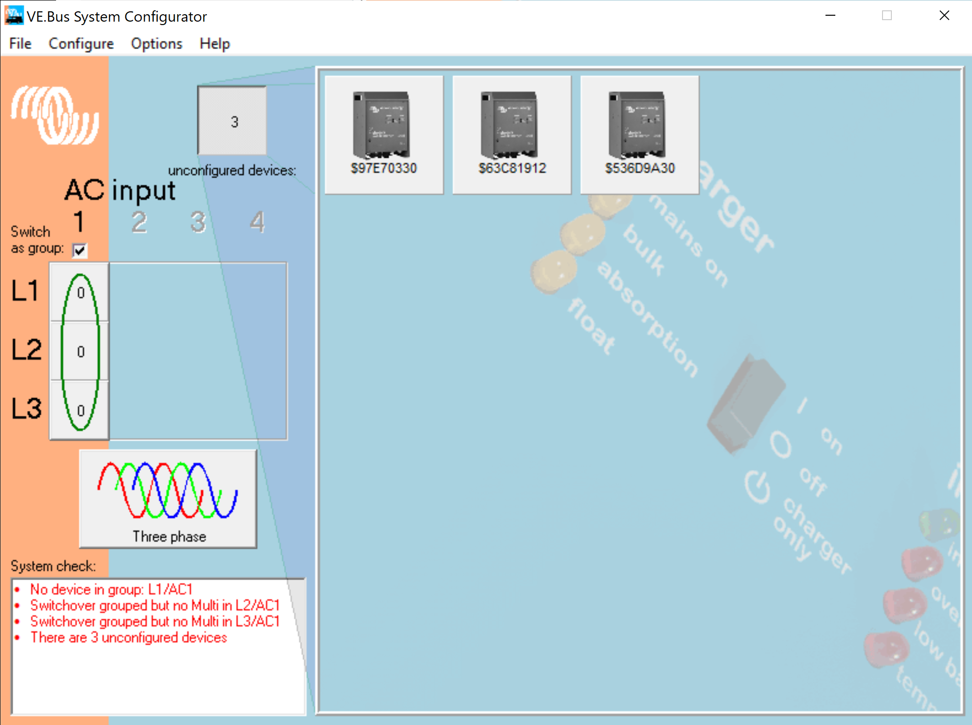 Pro prvotní nastavení se po resetu více hodí vebussystem configurator. Postup je propojit, napojit, spustit program, nastavit com port a propojit přes MK, po propojení a spuštění programu nabídka configure - get configurationa měli by se ukázat měniče, potom přes tlačítko zobrazující single phase zvolit jak propojit více měničů a jestli je mít jako group a drag and drop přesunout měniče do zvolené skupiny. Pořadí lze ověřit led diodou jako signál který měnič je který podle L1 L2 L3. Nakonec příkaz send configuration. A potom by měly být nastaveny podrobněji přes vebus config.