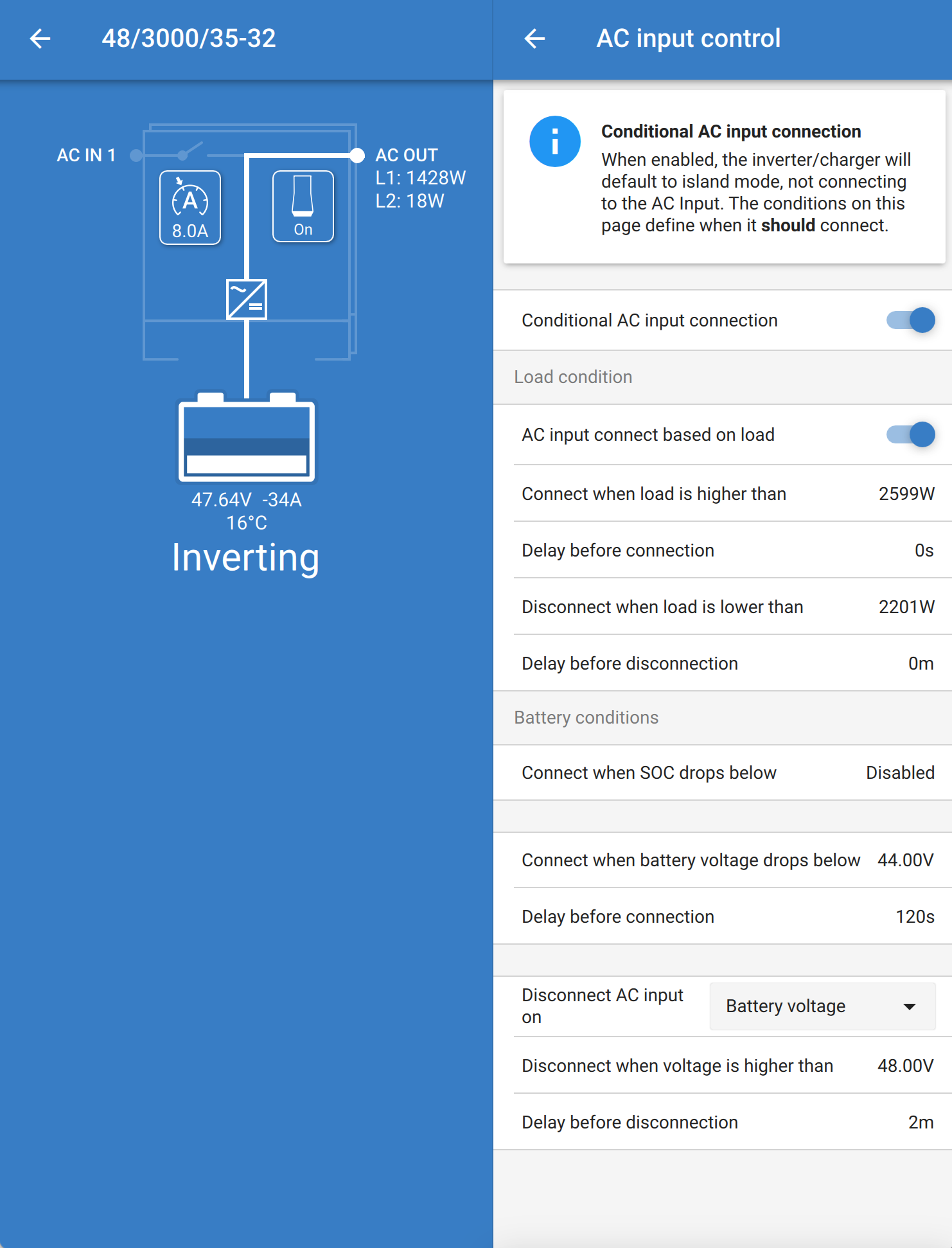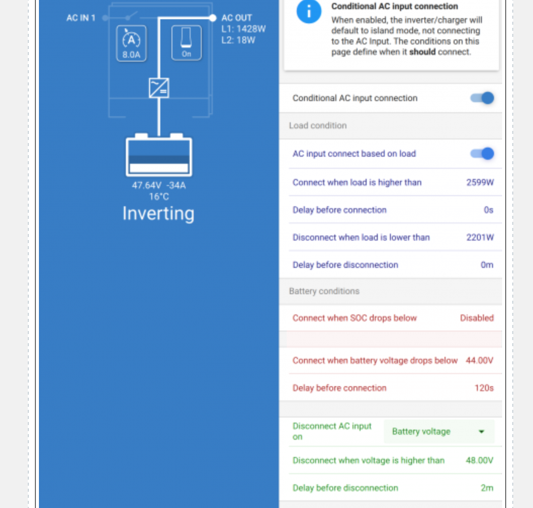VICTRON MULTIPLUS ll nákup 2022 ,konfigurace 3 fázová soustava, nefunguje hlídání přetížení (jednotlivých fází) a připojení na AC síť. AC ignore switch. Ať dělám co dělám vše funguje dobře pokud se přetíží fáze 1. Pokud se přetíží fáze 2 nebo 3 tak se na AC in nepřepnou. Žádná dobrá rada nikde není. Systém jede na solár a z baterií jen v případě náhlého přetížení jedné fáze musí přepnout na síť.