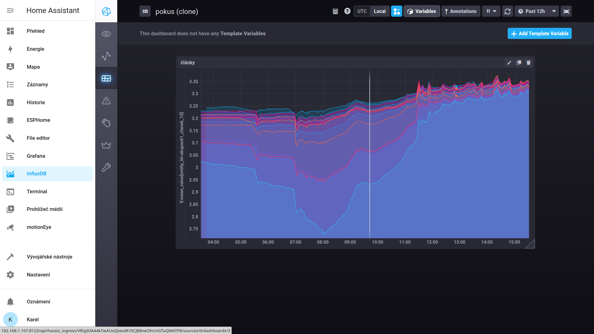 Jenom obrázek z HA z konce pokusu, v 8:00 se začalo nabíjet, jsou tam jenom napětí článků, proudy ne: