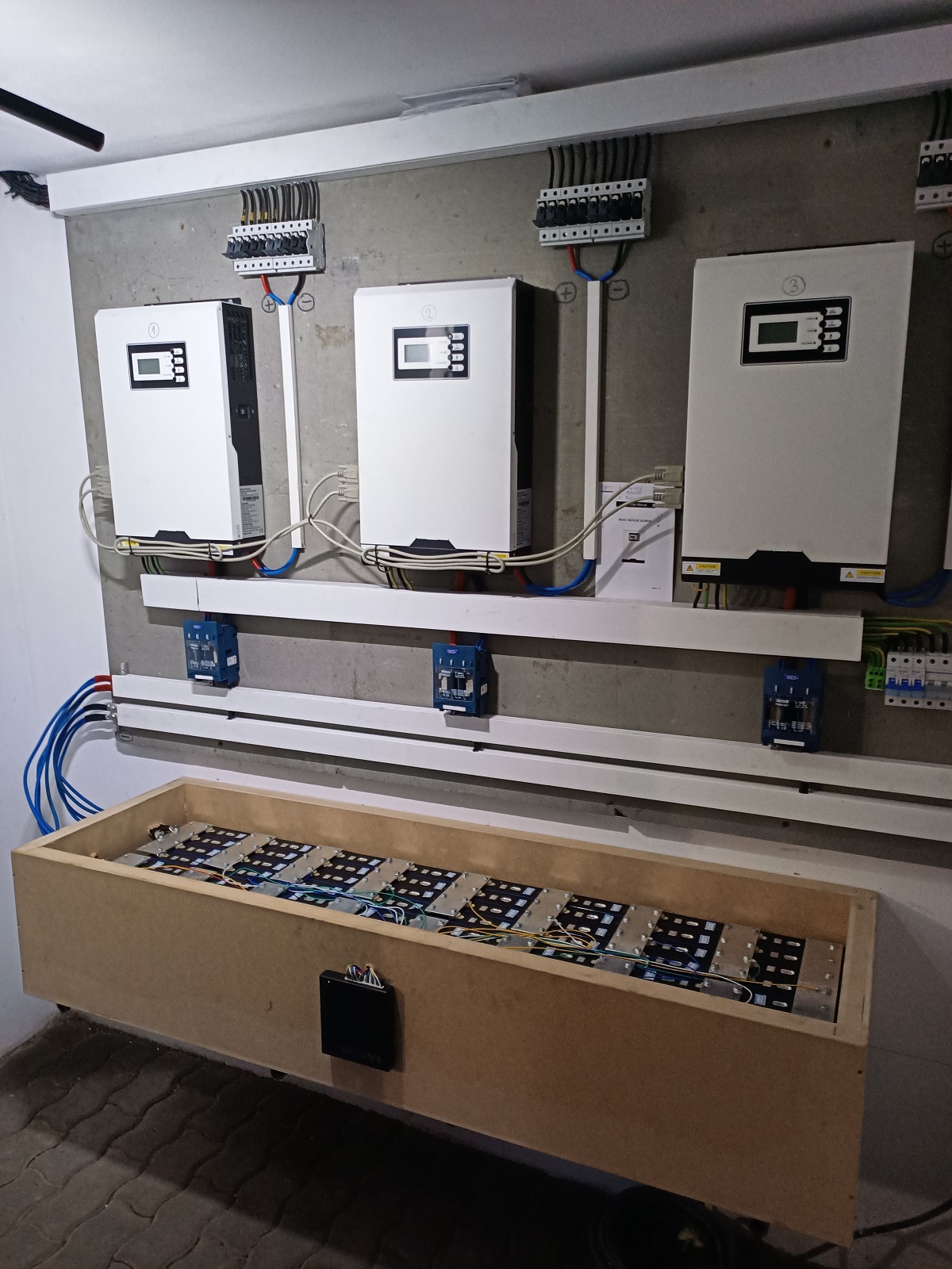 Tak jsem zdrátoval tu 3f FVE, už visí a nyní se čeká na baterku.Plky na barvu vodičů bych prosil vynechat,dávalo se co zbylo a jen označily konce- AC 10mm2,DC AL 10x10mm+3x40mm,panely 25mm2.Bude to žrát jako svině cca 200-240W na prázdno díky těm třem měničům. V předchozí instalaci dvou paraelních je ten druhý aspoň odpojen přez proudové relé na výstupu AC do domu a připne se jen ,když jdou do domu víc jak 4kW s 5s histerzií.