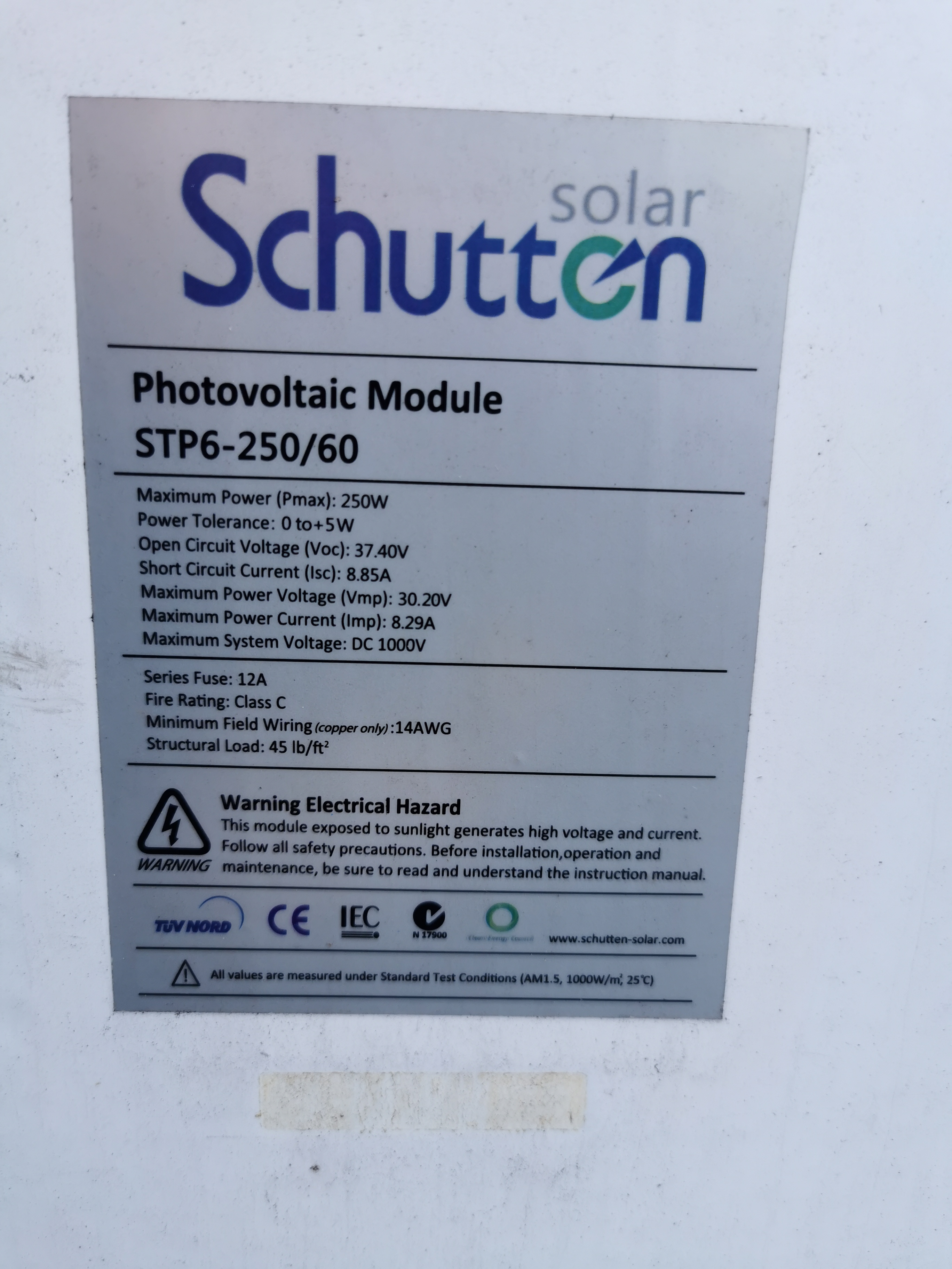 Nabízím k prodeji 24 kusů polykrystalických solárních panelů Shutten o výkonu 250W, zakoupených v roce 2014. Panely jsou v dobrém stavu, bez prasklin, s bílou zadní folií, rozměry 1640 x 992 x 40 mm. Byly používány na střeše, zapojeny 8P3S s uzemněným mínus polem. Preferuji odběr všech 24 kusů najednou, lokalita Bystrice pod Hostýnem, 30 km od Zlína. Cena za kus je 1900 Kč, při odběru všech 24ks sleva na 1750 Kč za kus.