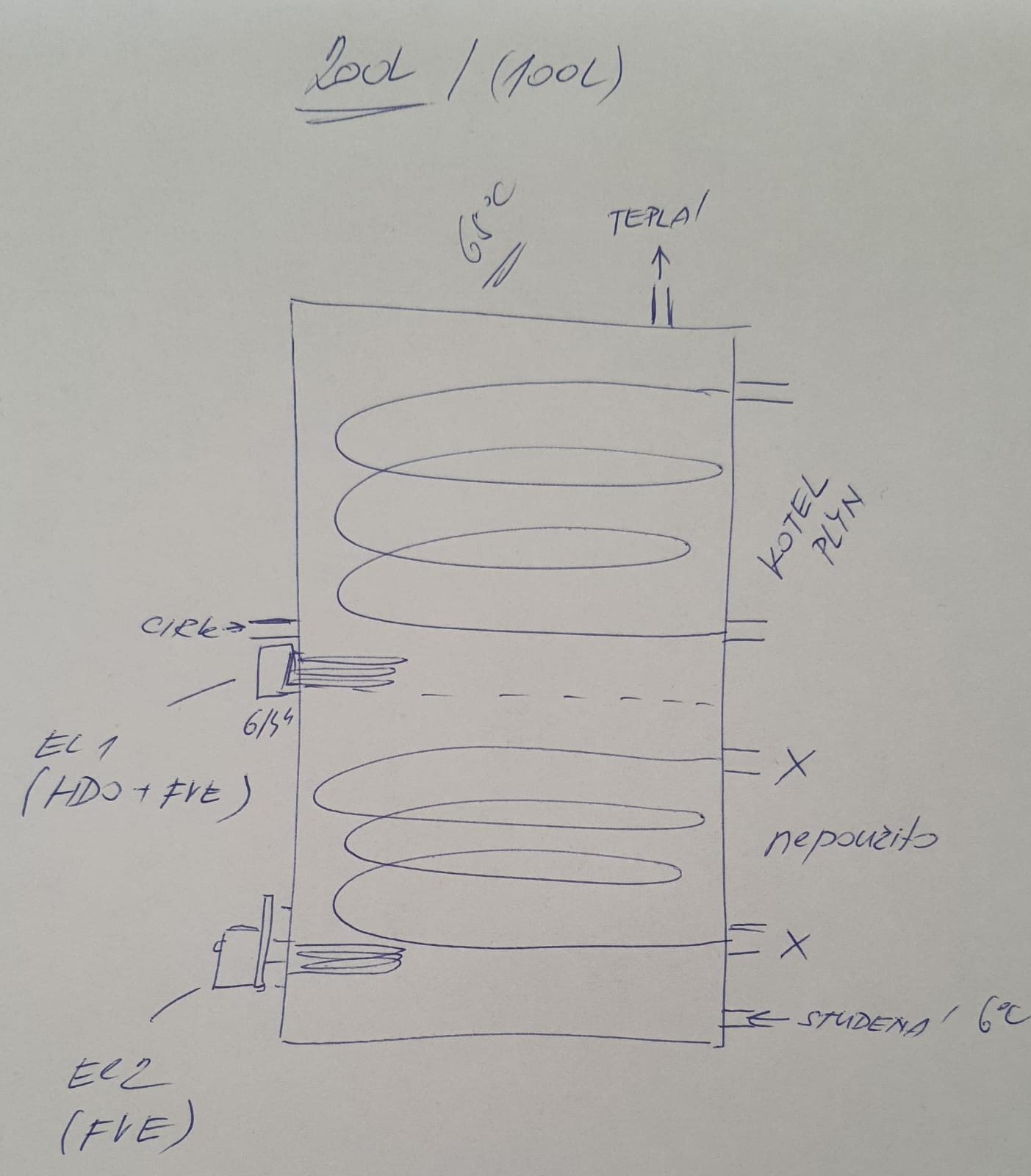 aktivní využívání horních 100L a v záloze dalších 100L na přebytky. V zimním období, kdy bude systém dodávat desetinu výkonu si říkám že bude lepší to posílat nahoru do EL1.