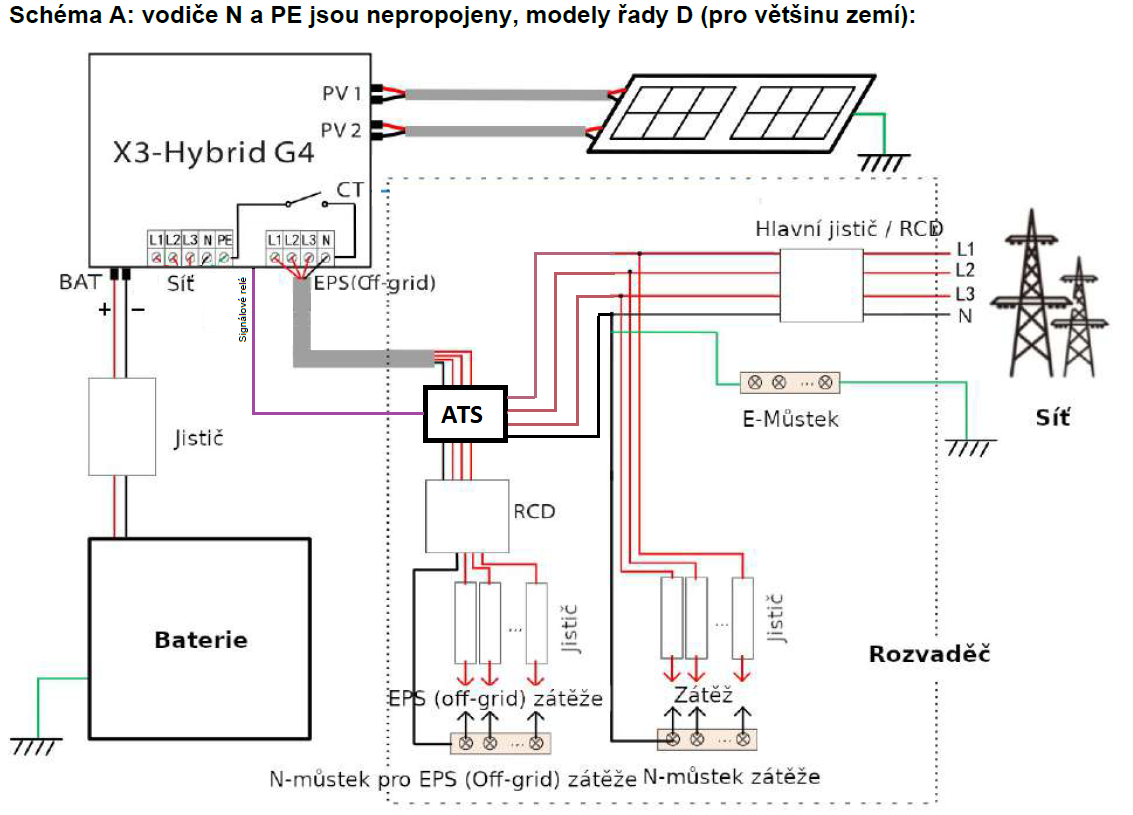 V prípade nedostatku slnečného svetla a nízkeho napätia batérií by sa cez prepínač sietí ATS odpojil 3-fázový EPS výstup meniča od spotrebičov a spotrebiče by sa pripojili na 3-fázovú DS.