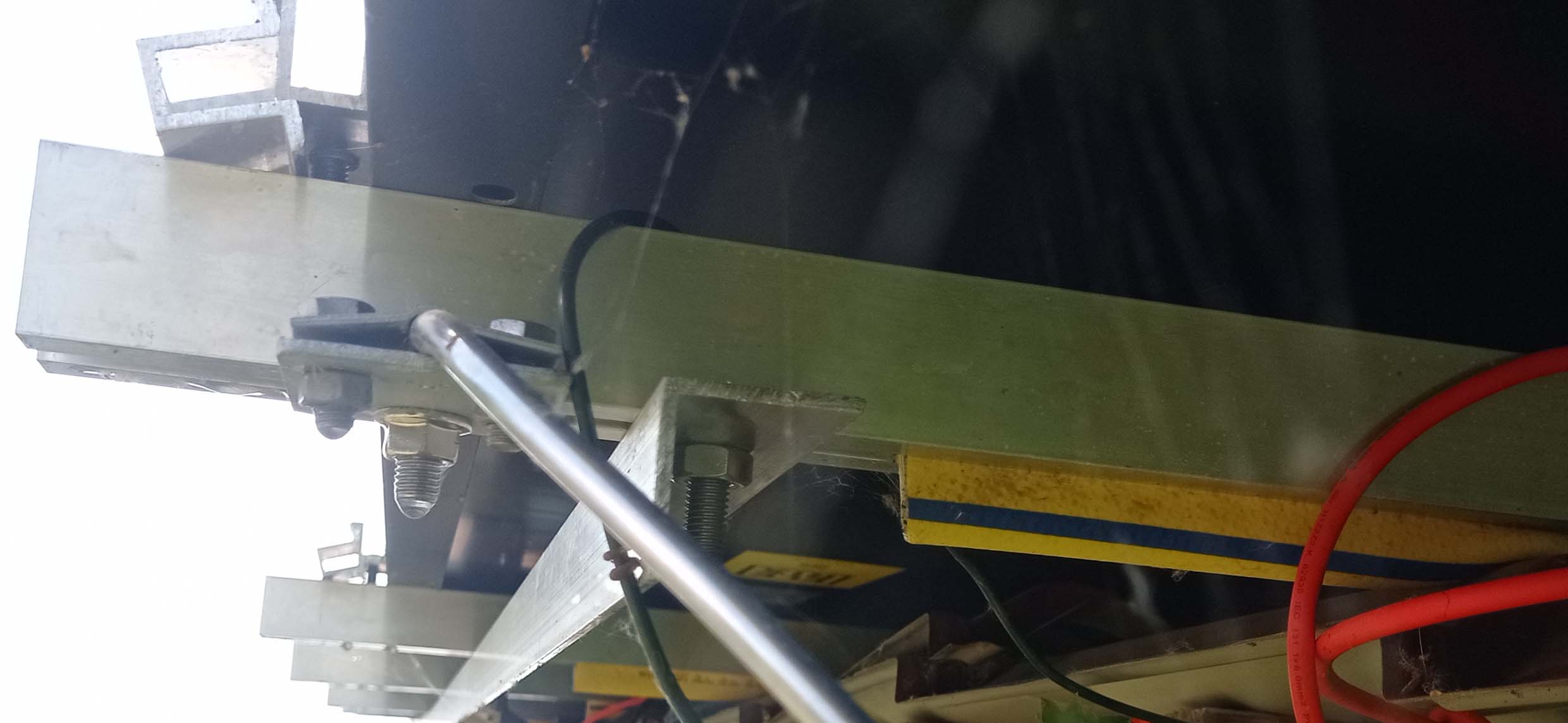 Vodorovné profily nejsou vůbec kotveny skrz (plechovou) krytinu, ale vzhledem k nízkému sklonu střechy jsou pro 6 panelů na svých 6 metrech délky přichyceny k pomocné konstrukci jen na krajích. A aby se plechová střecha od profilů nepoškrábala, tak je do drážky profilu vtlačeno několik kusů hadice - byla na vyhození, takto našla nový život. Na jiné (obdobně řešené) střeše jsem místo hadice lepil zespodu nařezané zbytky polystyrénu, ale to bylo pracnější. I tak to po 4 letech nevyžadovalo opravu.