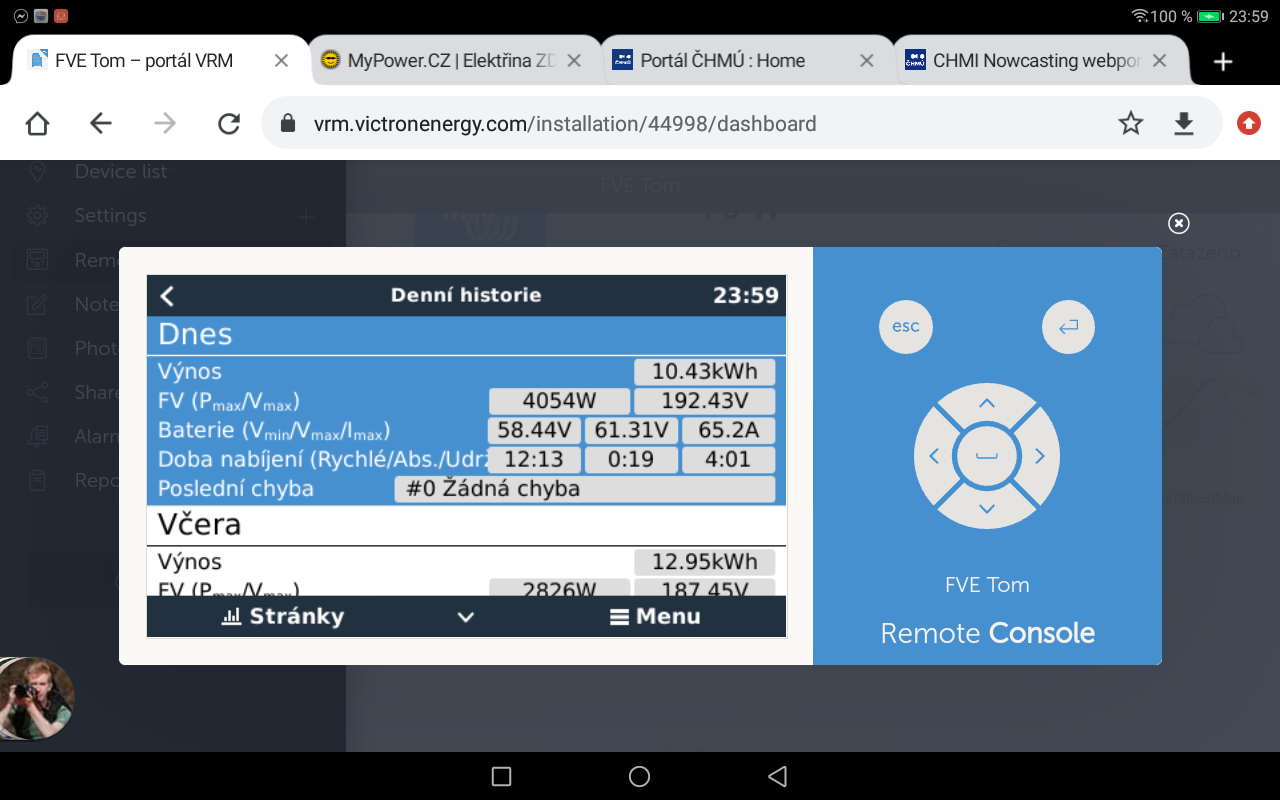 5,4 kWp JJZ 4deg,1,8kWp JV 24deg, do 13.8.2022 bylo 3,6 kWp, MPII 5k, Victron MPPT 250/85-TR, aku 9,45 kWh Lion 15S, BMS 200A, Smart Shunt 500A.