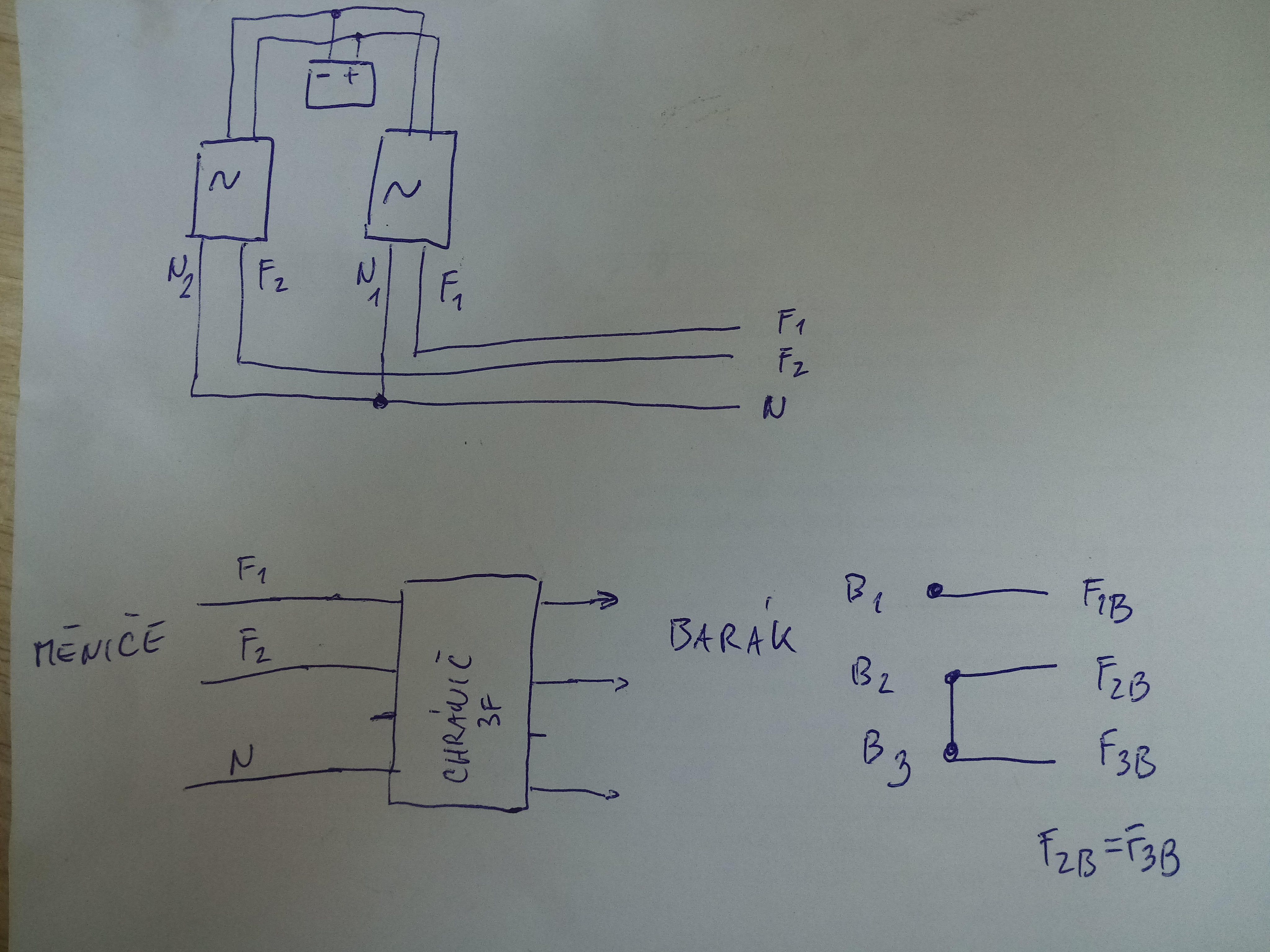 Pokud jsem si vsiml dobre, tak faze nespojuje menicu, ale baraku. Tedy jeden menic jde na okruh z jedne "byvale" faze, druhy menic na okruhy ze druhe a treti.