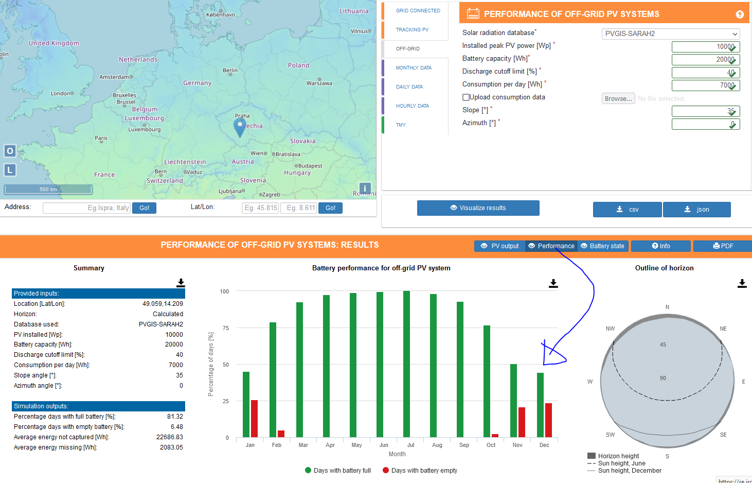 Vyjádření kvality návrhu čehokoliv pomocí jednoho čísla může být velmi zavádějící. V případě PVGIS je lepší orientovat se rozhodně podle grafů. Pro ongrid FVE je graf "PV output" zcela dostatečný. Pro off-grid FVE je ale mnohem důležitější graf "Performance. Ten ukazuje kolik, dní v každém měsíci bude v pohodě a kolik dní bude naopak baterie vybitá. Viz níže.