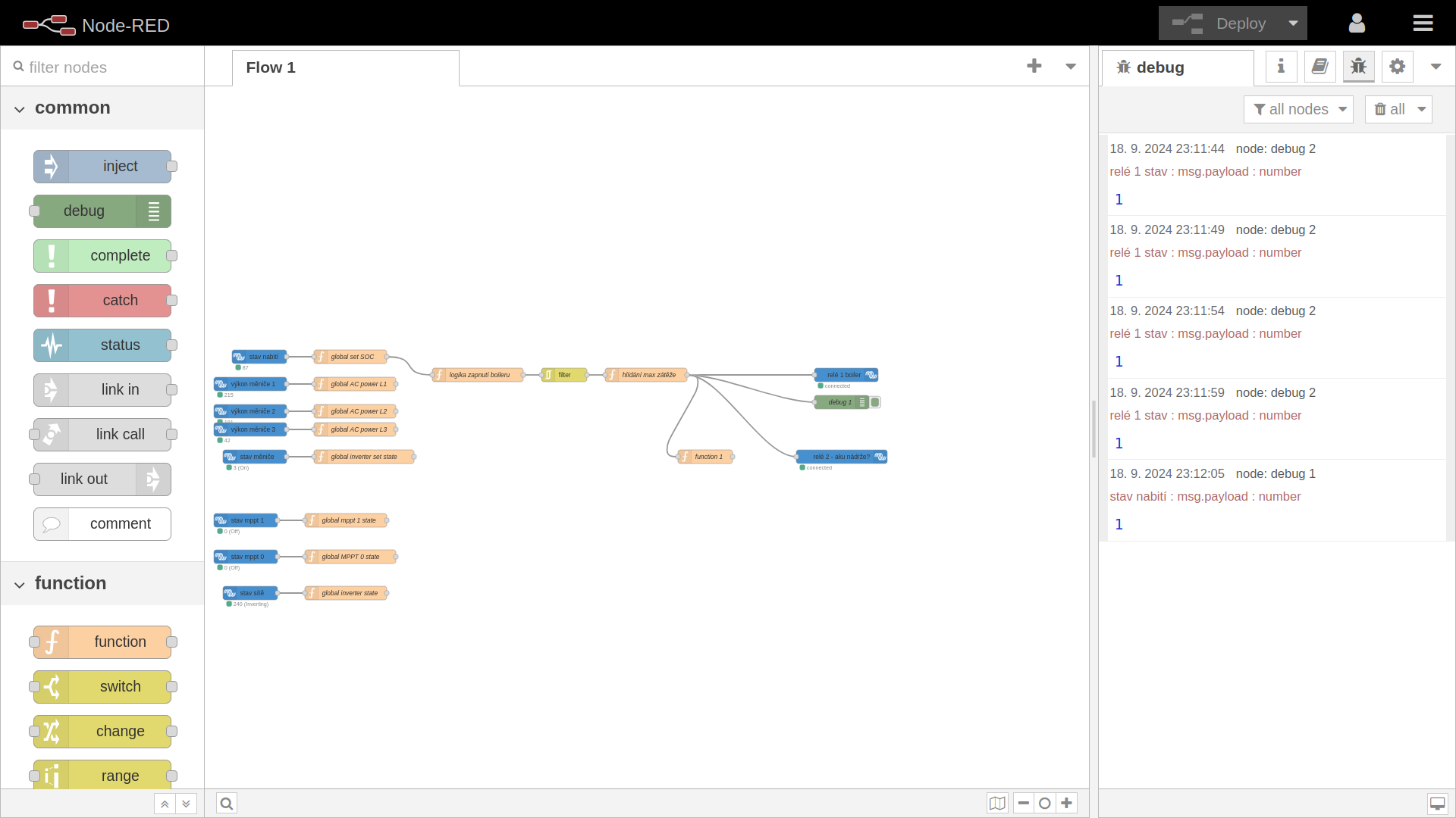 Hlídání výkonu po fázích mám v Nodered taky, všechno máš k dipozici, klidně ti to postnu, i když to mám napsaný hodně neuměle, moc mi ten nodered nepřirostl k srdci. Hlavně je tam proti arduinu mnohem jednodušší ladění, všude vidíš, co se děje... Tady je ukázka rozpracovanýho flow pro spínání boileru a a ohřevuz akunádrže, zatím to není komplet, a to je další výhoda, zprovozníš to klidně po částech. Momentálně pro připojení ovládání boileru stačí dotáhnout drát ke stykači a ověřit, že to chodí jak má. Snímek obrazovky pořízený 2024-09-18 23-12-33.png