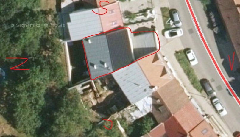 Garáž nepřipadá v úvahu, bude ve stínu. Na západní části střechy jsou klimy? To bude vrhat stíny, takže by se dala využít jen část. Východ vypadá ok.