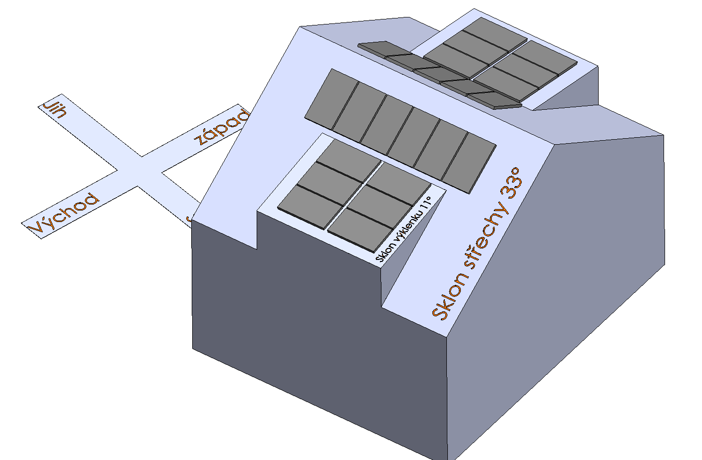 - hlavní střecha má úhel 33°, výklenky 11°