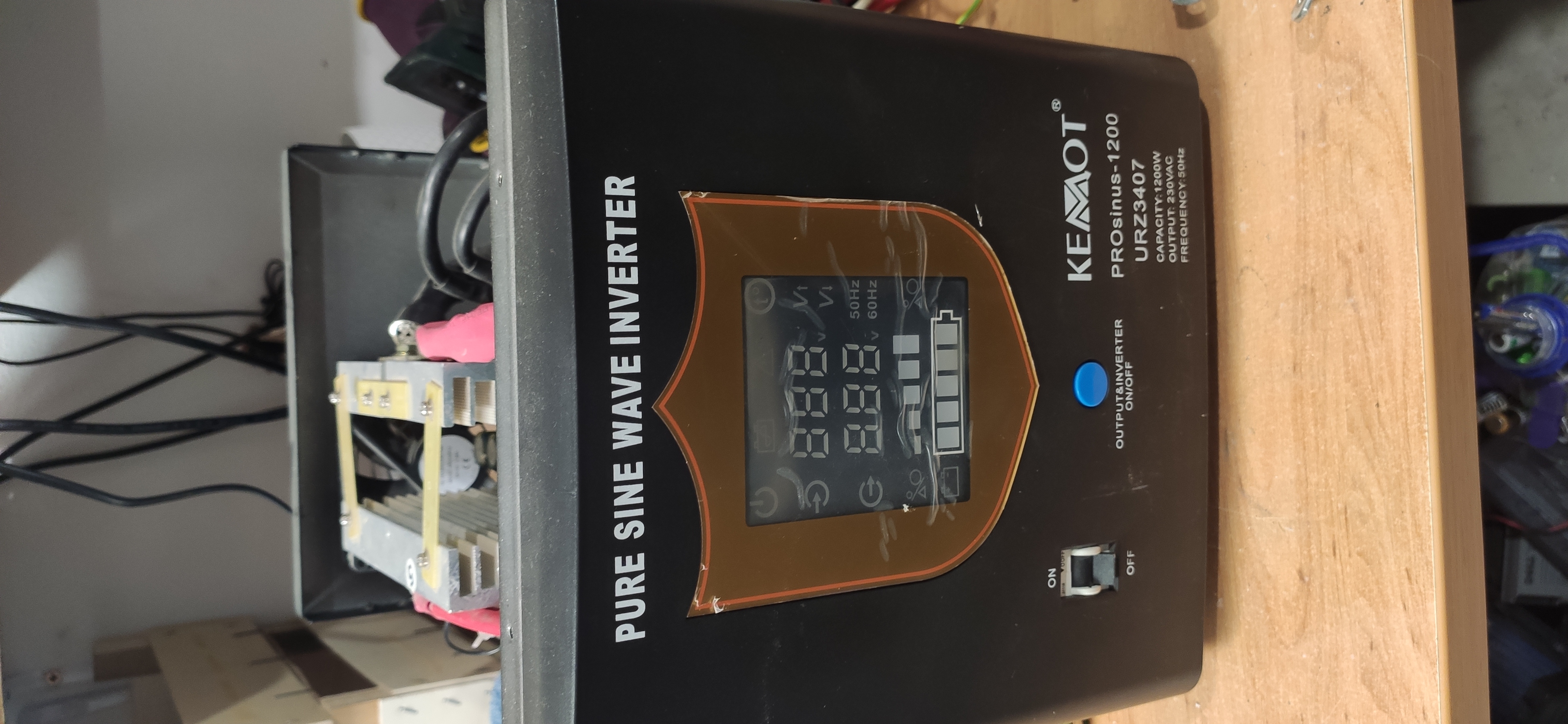 Nabízím nefunkční UPS menič Kemot Prosinus 1200W s čistým sínusem. Po výměně tranzistorů a odporů se zařízení nespouští na AC, pravděpodobně je problém v řízení. Prodávám za cenu součástek, vhodné pro opravu nebo náhradní díly, přikládám fotky.