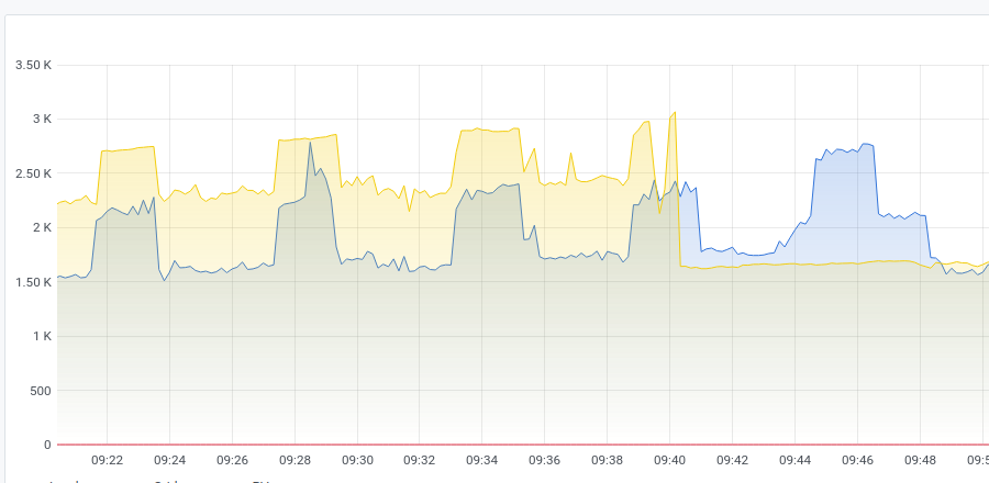 A pokud jela pračka (2kW, protože ohřívala vodu), tak jak na potvoru na chvíli sluníčko zašlo za mraky - FVe to nestihla, tak cucalo z baterií, ale za cca 5 minut to skočilo do bypass - baterky vybité