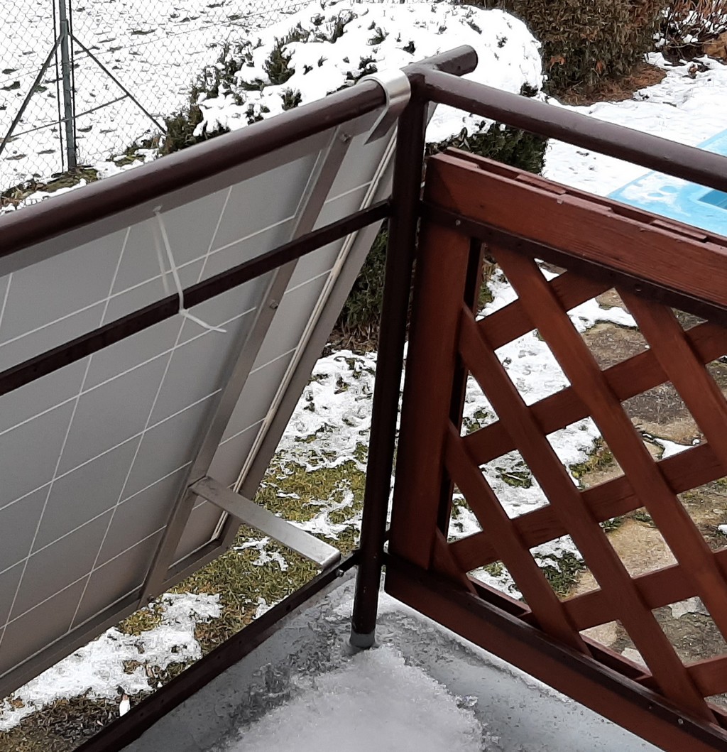 Když se vrátíme k začátku vlákna, tak já svoje panely umístnil na balkon takto. Páskovina 4x40x1200, zevnitř panelu další páskovina 10x20xvnitřní šířka panelu. Takže mi to sešroubované tvoří takové téčko, které zvětšuje tuhost. Jinak by mě vítr přes tu vzpěru ty panely poškodil.