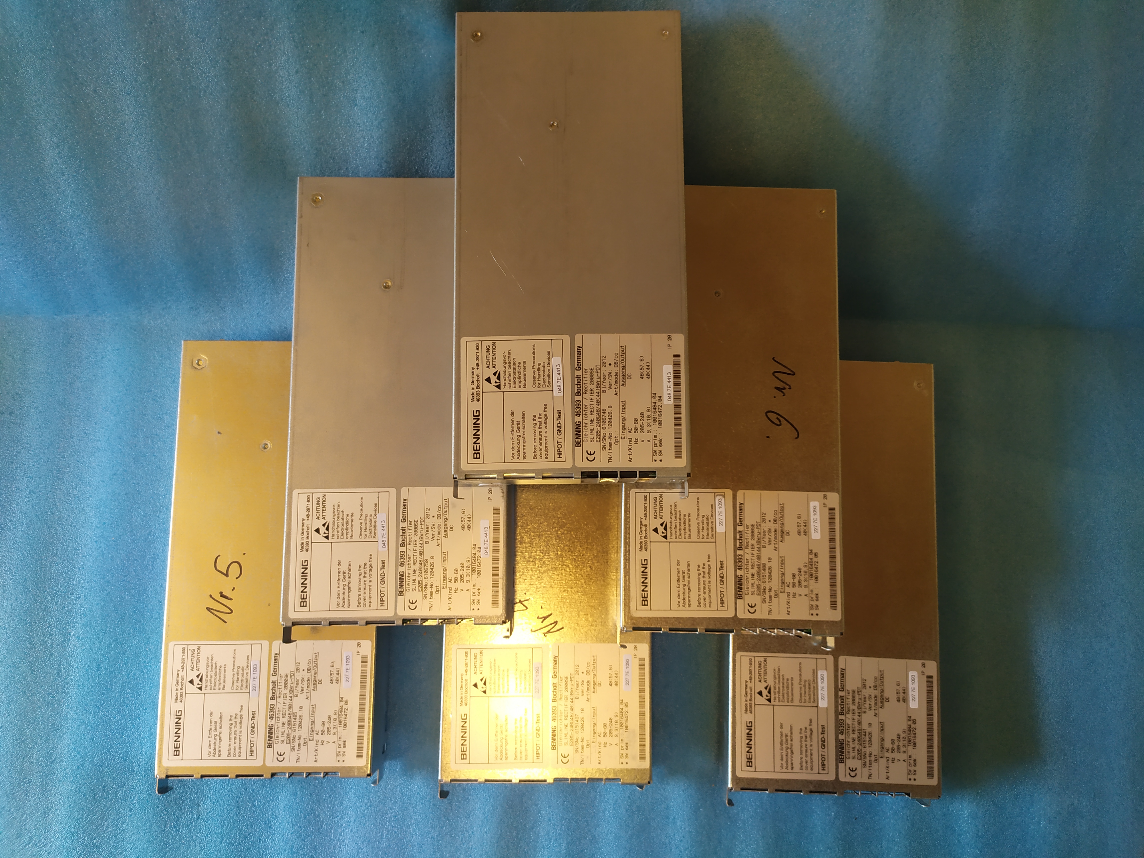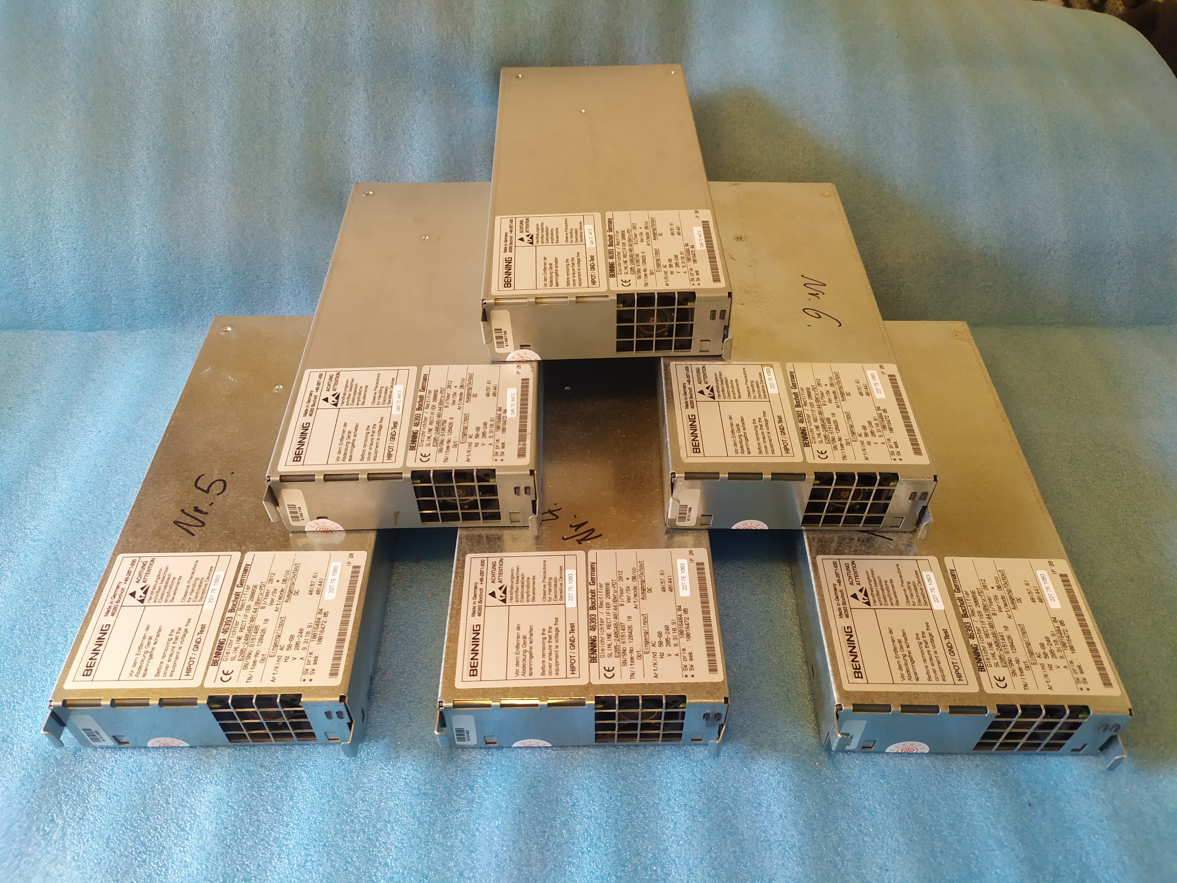 Nabízím 6 kusů použitých usměrňovačů Benning 46393 s parametry 230V/48V a proudem 40A. Cena za jeden kus je 800 Kč, kompletní sada se zásuvnou šachtou do 19" racku stojí 5000 Kč. Usměrňovače byly využívány v telekomunikacích a jsou vhodné pro nabíjení baterií v 48V systémech. K dispozici jsou také technické fotografie a informace o stavu zařízení.