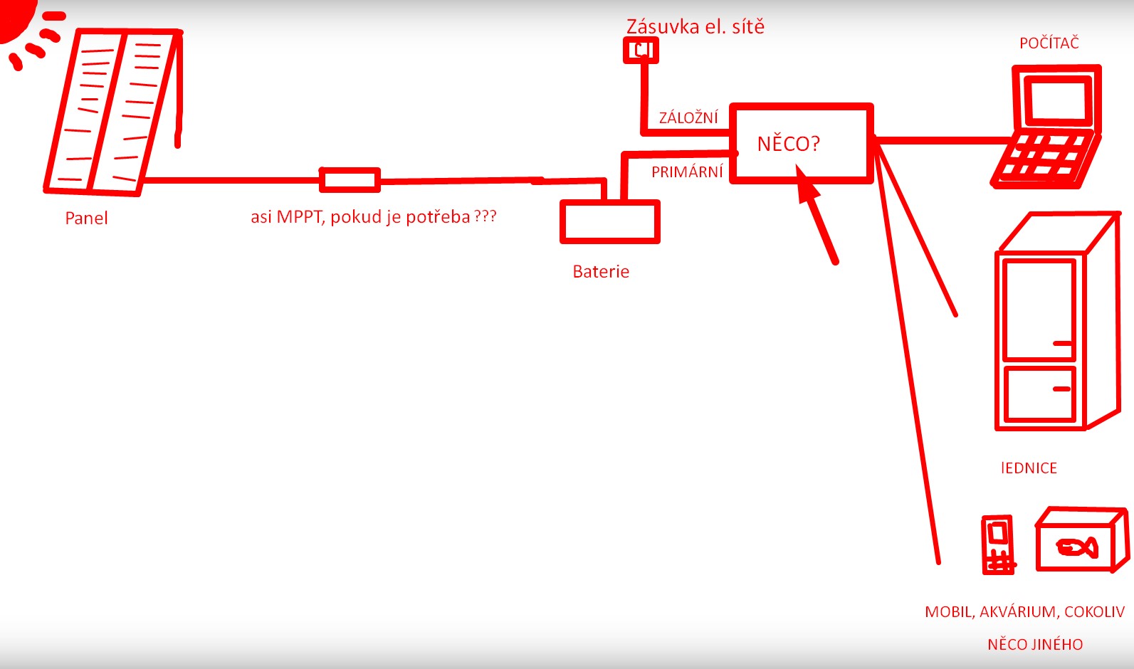 . Topologie by mohla být taková, že místo "..asi MPPT, pokud je potřeba ???.." by byl zapojen solární regulátor (zda MPPT nebo PWM by záleželo na VOC panelů a napětí baterie), který by stabilně nabíjel baterii. Mezi "Baterie" a "NĚCO?" by byl navíc připojen obyčejný sinusový DC/AC měnič. No a jak už jsem napsal, "NĚCO?" by byl přepínač sítí.