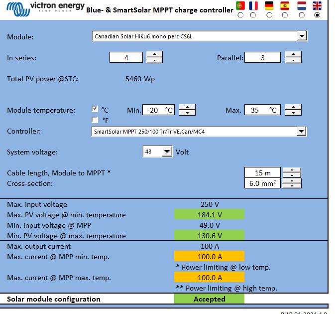 Přes konfigurátor Victron pro MPPT posuzuji, který regulátor by byl vhodný a jaké zapojení panelů zvolit. Vychází mi pro panely CS 455 Wp a regulátor 250/100 4 panely v sérii a 3 paralelně. U 6s2p mi již nevychází VoC. Jiná možnost zapojení asi není, že?