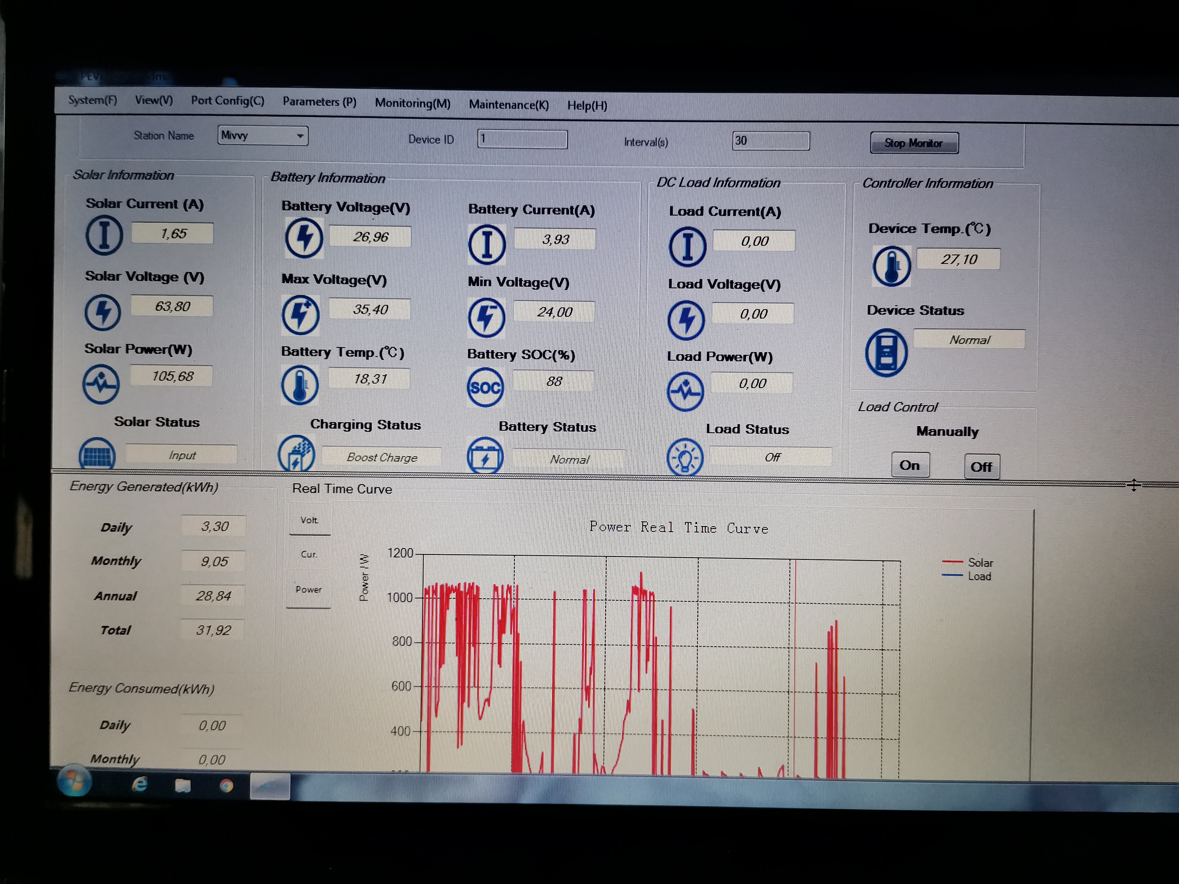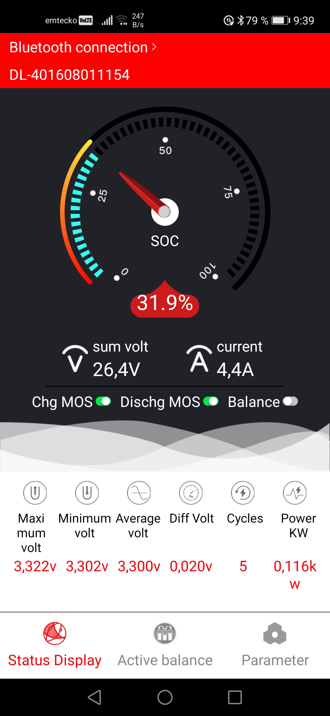 A tak jsem vypnul střídač aby se baterie nevybíjela vlastní spotřebou střídače a připojil proudový zdroj 15A po dobu 3 hodin abych mohl přibližně určit která hodnota SOC je reálná a která ne. Chci v další etapě zhotovit i dálkový monitoring, tak z čeho sosat data. Dnes ráno, jsem opět zjišťoval SOC baterie. Rozdíl hodnot 85% a 32% je nebetyčný. Podle mého mínění EPsolar určuje SOC z napětí baterie a BMS z protečeného náboje, proto věřím a přibližným výpočtem si potvrdil, že BMS dává reálné hodnoty. Jak ale zkalibrovat hodnotu na regulátoru? Nenašel jsem řešení. Podle návodu by to snad jít mělo, ale mě se to nedaří. Pomůže někdo radou nebo to nejde? Rozdíl v proudech na fotkách je způsoben několikaminutovým posunem pořízení snímků. v principu je to bezvýznamné.