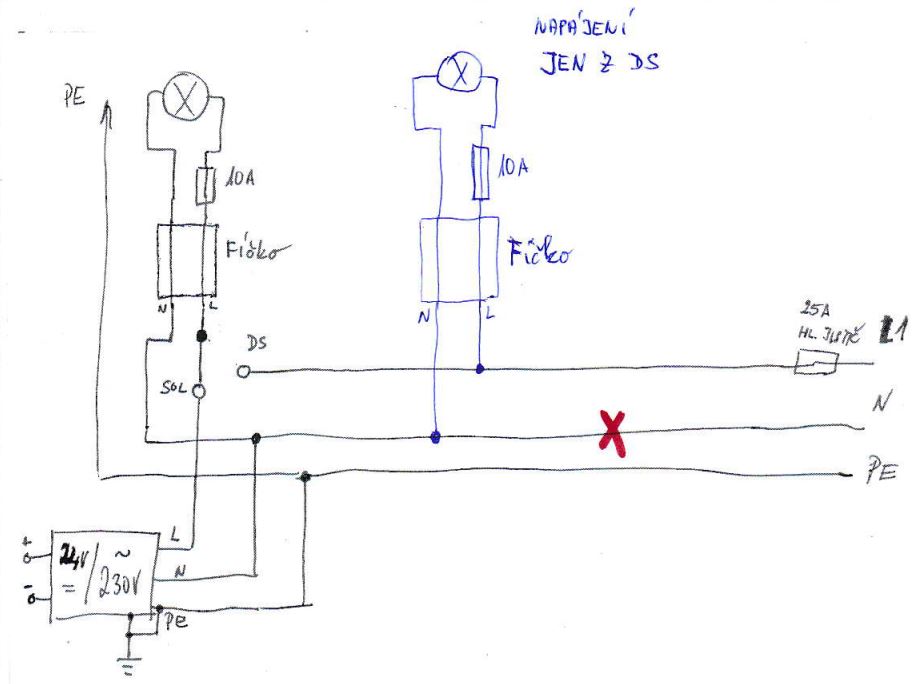 - čistě hypoteticky by se přerušil N vodič někde na straně DS - viz obrázek.